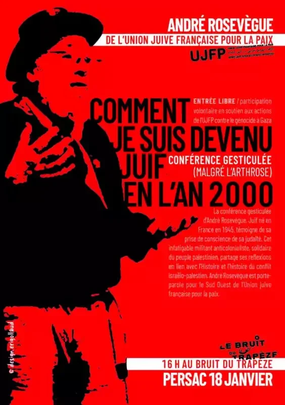 Un parcours parmi d'autres, comme les 21 racontés dans l'ouvrage "Parcours de Juifs antisionistes en France" (Editions Syllepse 2022) dont il est l'auteur. Mais chaque parcours est singulier (tous n'ont pas été louveteaux ... contrairement à André). André Rosevègue est l'un des porte parole de l'Union Juive Française pour la Paix, enseignant retraité, infatigable militant, inlassable meneur de débats. Il se fait conférencier passionnant, plein d'humour et d'auto-dérision, comme vous pourrez le constater. Cela fait un bout de temps que ça lui trottait dans la tête, et le voilà enfin passé à l'acte dans cette conférence gesticulée qui raconte son histoire avec son identité...il